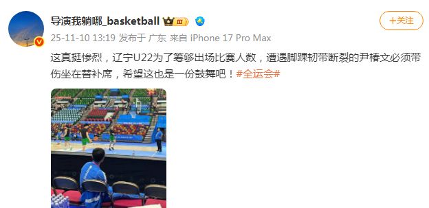 根据媒体人导演我躺哪_basketball报道,辽宁U22男篮为了凑够出场比赛人数,让遭遇脚踝韧带断裂的尹椿文,必须带伤坐在替补席凑人数。
